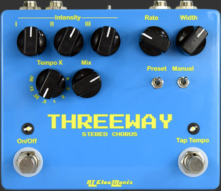 RT ElecTRonix is proud to present the Threeway Stereo Chorus. The Threeway features 3 chorus voices supported—each—by their own bucket brigade devices. This blend of different voices makes for the thickest, lushest chorus sound imaginable.